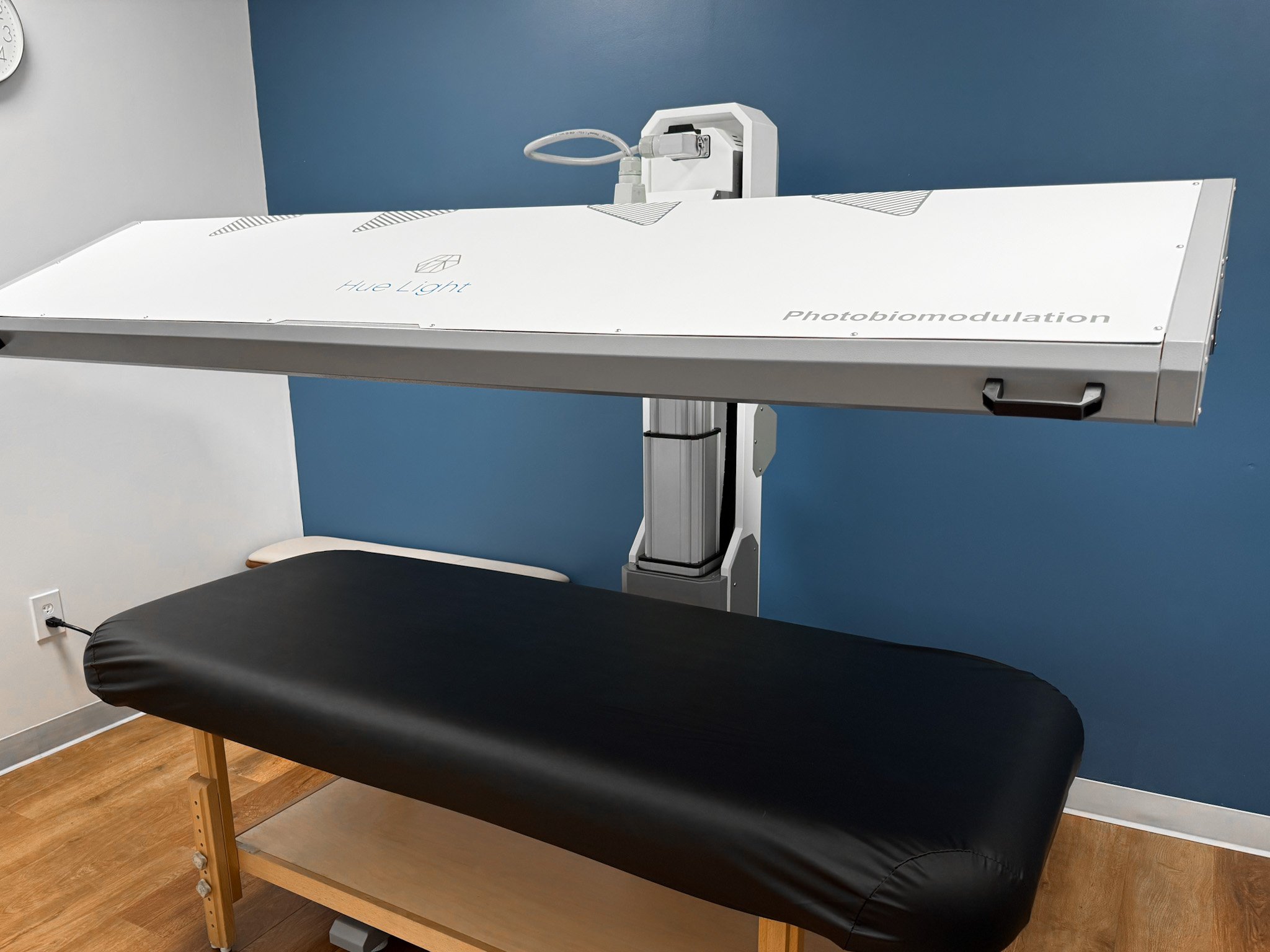 Our office uses the HueLight Full-Body PBM Panel, a medical-grade photobiomodulation system equipped with 17,280 LEDs delivering five clinically researched wavelengths across the full light spectrum: